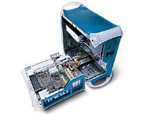 - O novo Powermac G3 é da mesma cor do iMac (e não azul escuro como se previa) e tem uma porta lateral de muito fácil utilização.